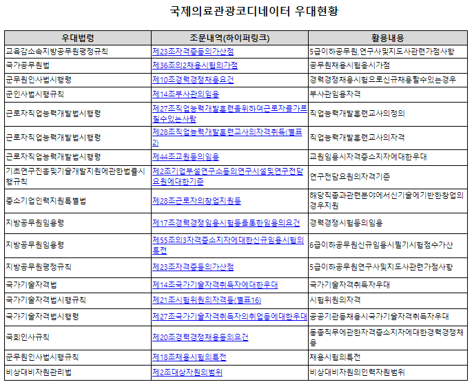 - 보건의료 또는 관광분야 학과 졸업자: 관련 전공의 대학교 졸업자 및 졸업 예정자.