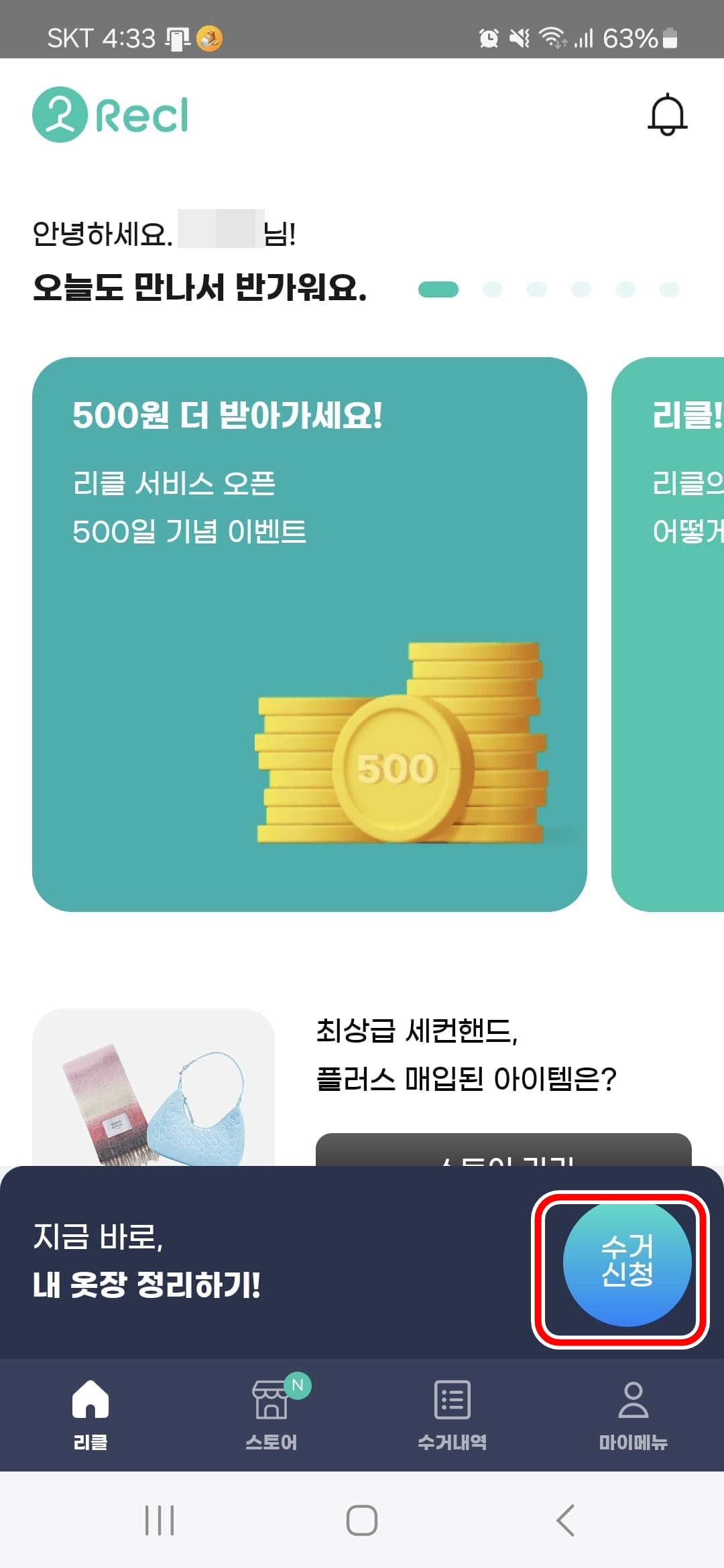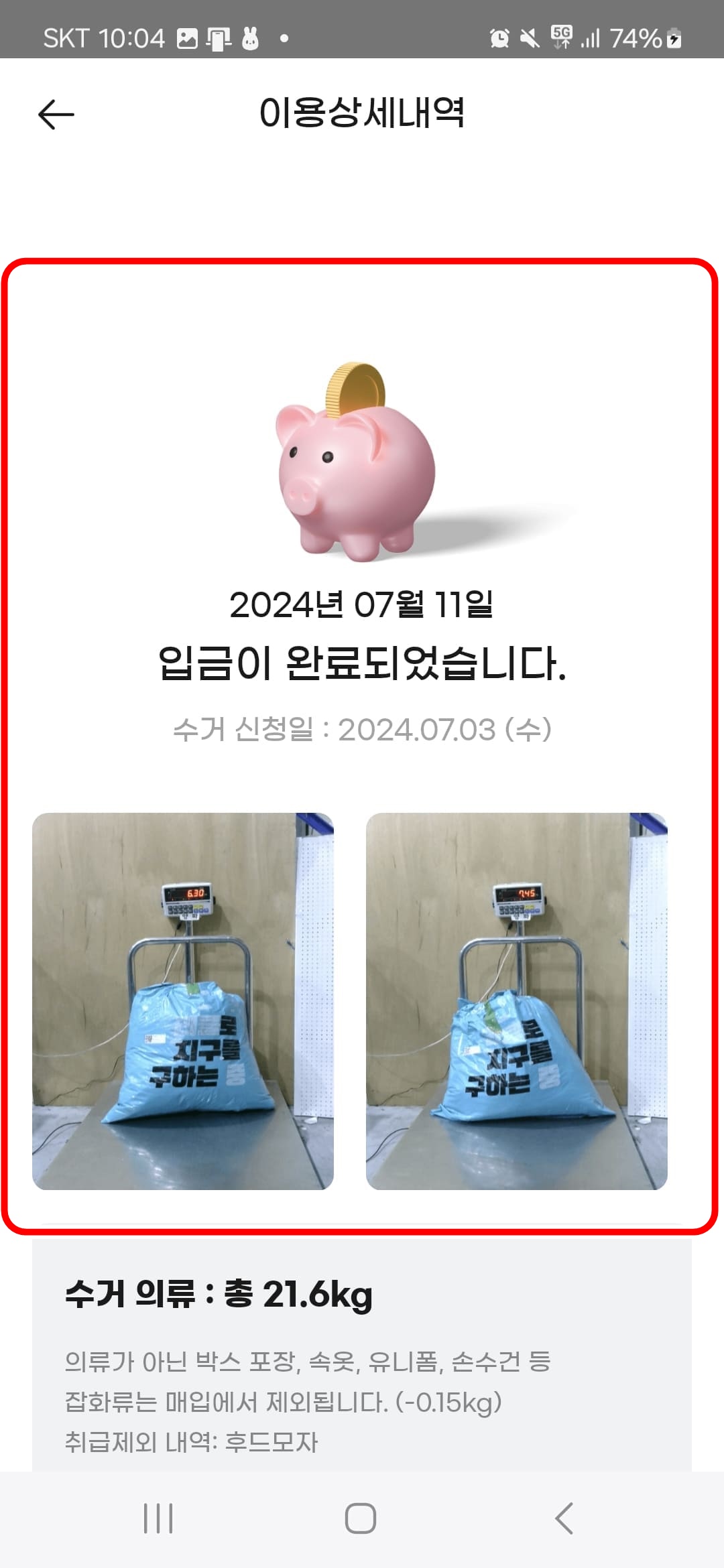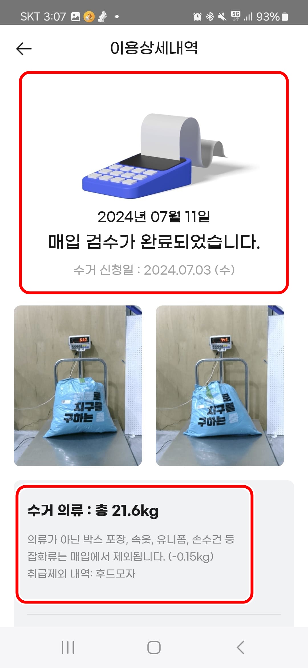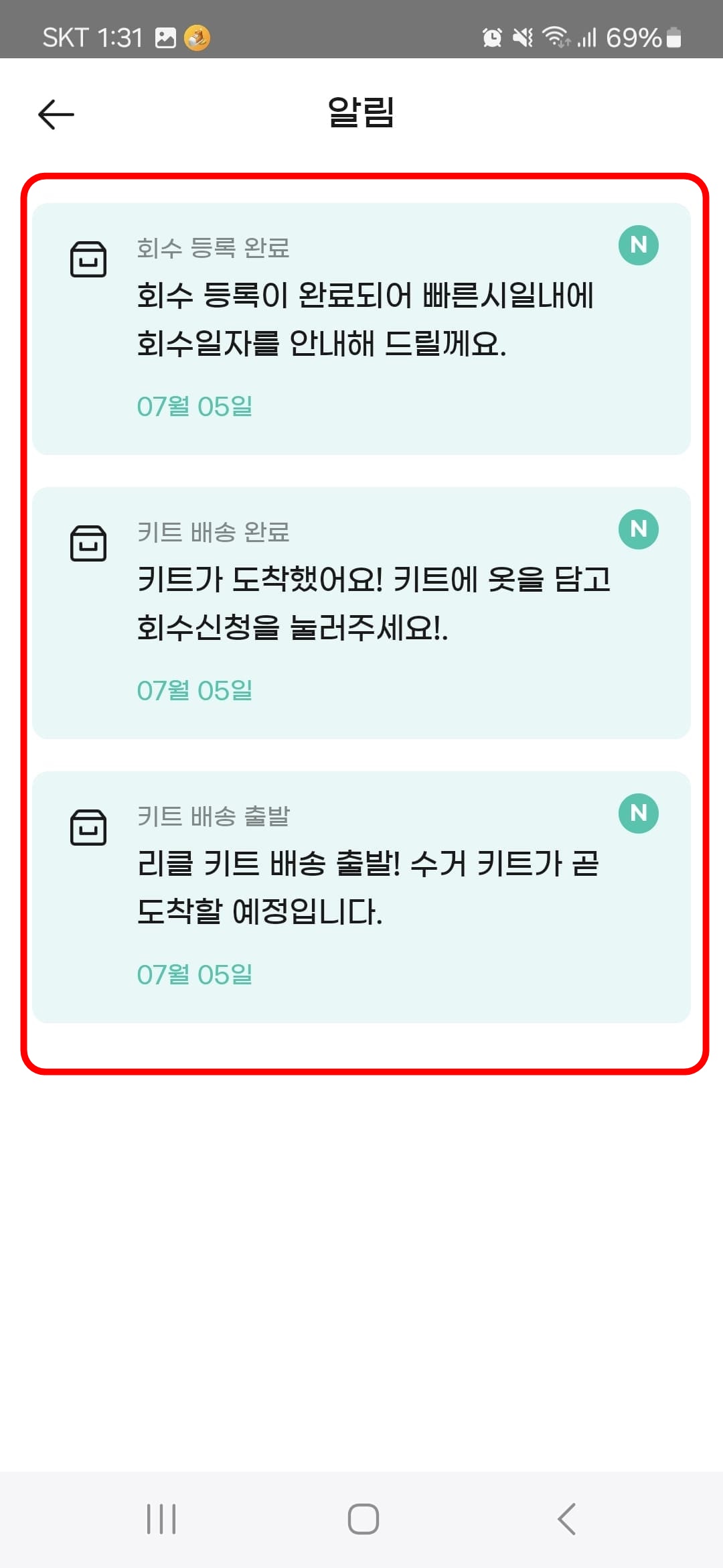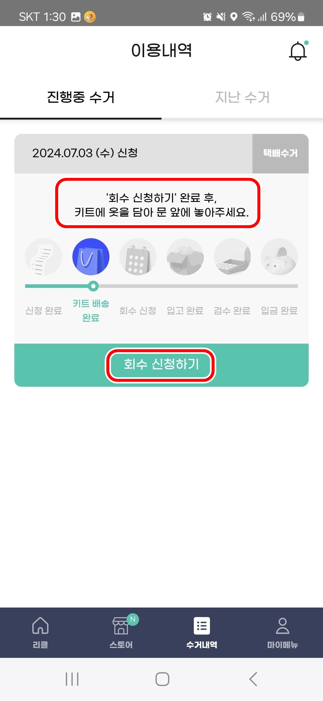 옷을 담아 문앞에 놓았으니 리클 앱에 들어가서 밑에 수거내역 아이콘을 누르면 위쪽 맨 첫번째 캡쳐화면이 나옵니다.
