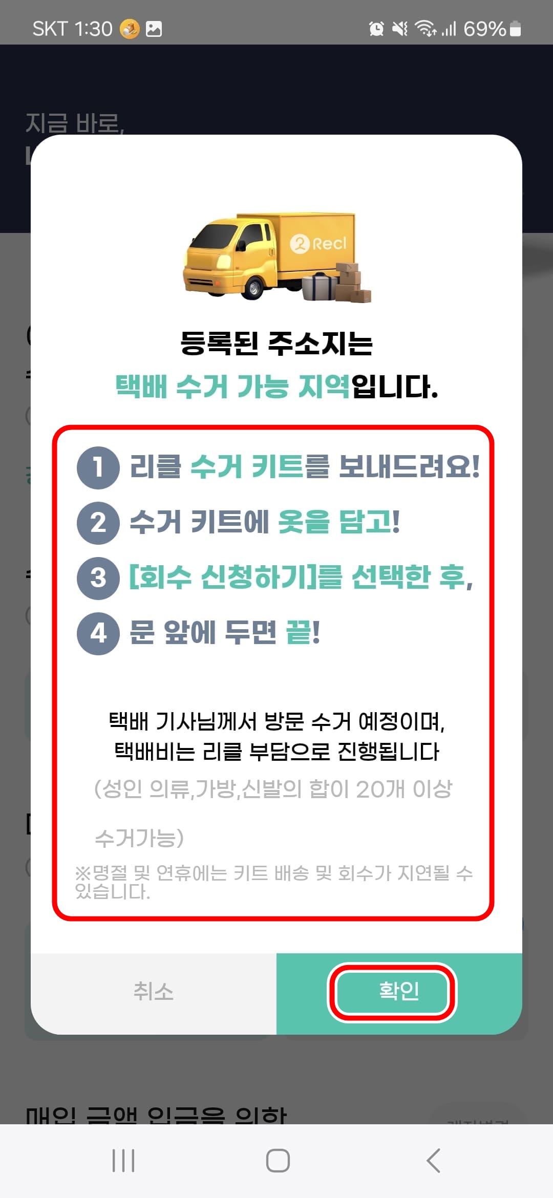 회원가입시 등록된 주소지가 택배 수거 가능지역이라는 안내와