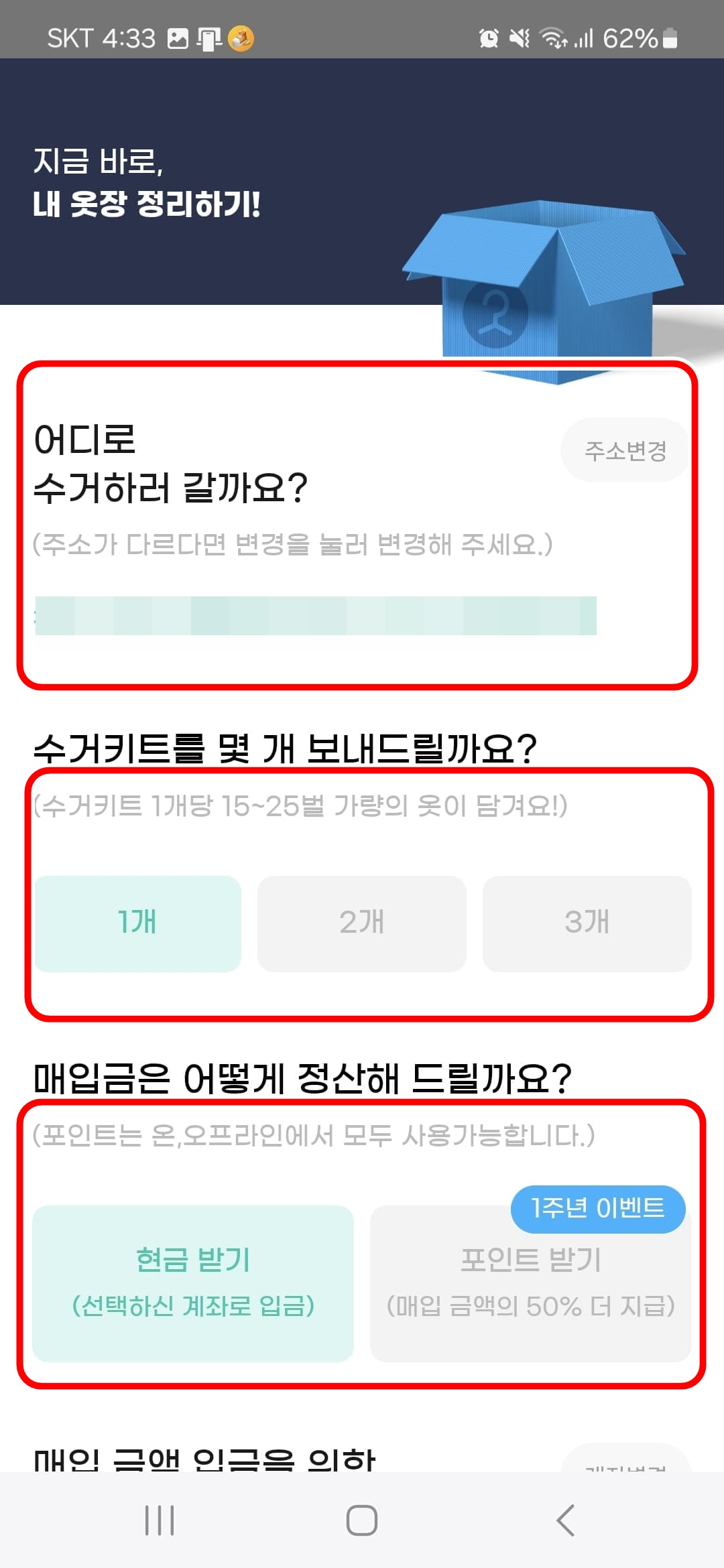 수거키트를 몇개를 보낼까요?부분은 수거할 옷을 담을 봉투를 몇개를 받고 싶은지 선택하는 겁니다.
