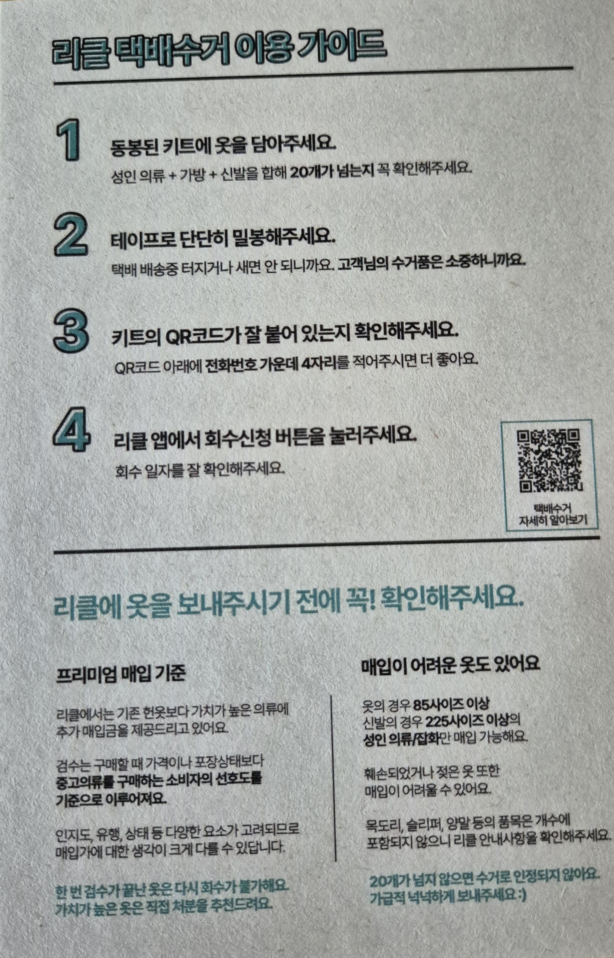 수거 비닐과 함께 리클 택배수거 이용가이드라고 작안 안내 용지도 같이 들어 있습니다.