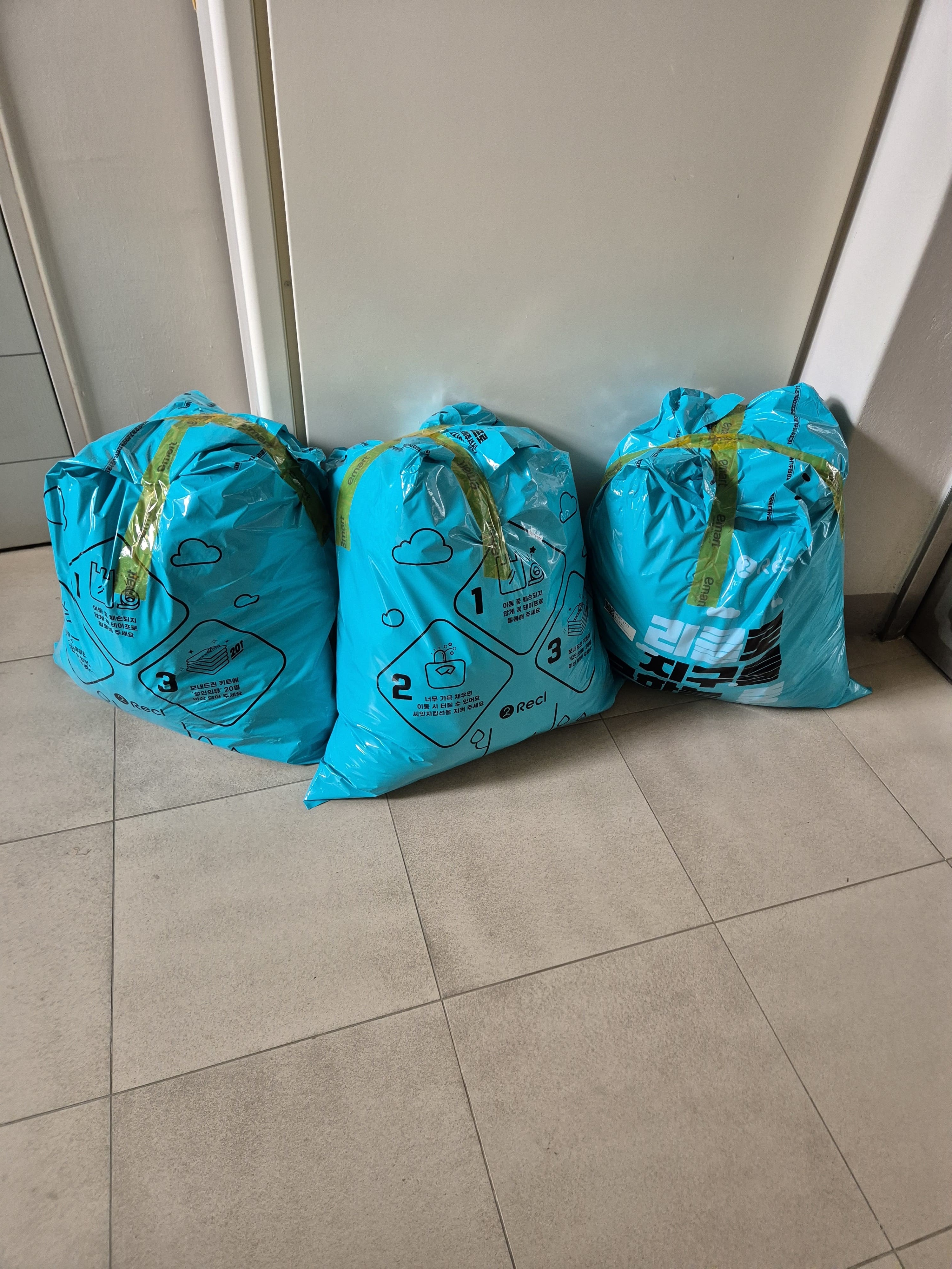 헌옷을 담은 리클 봉다리를 현관문 앞에 내놓고 사진을 찍습니다.