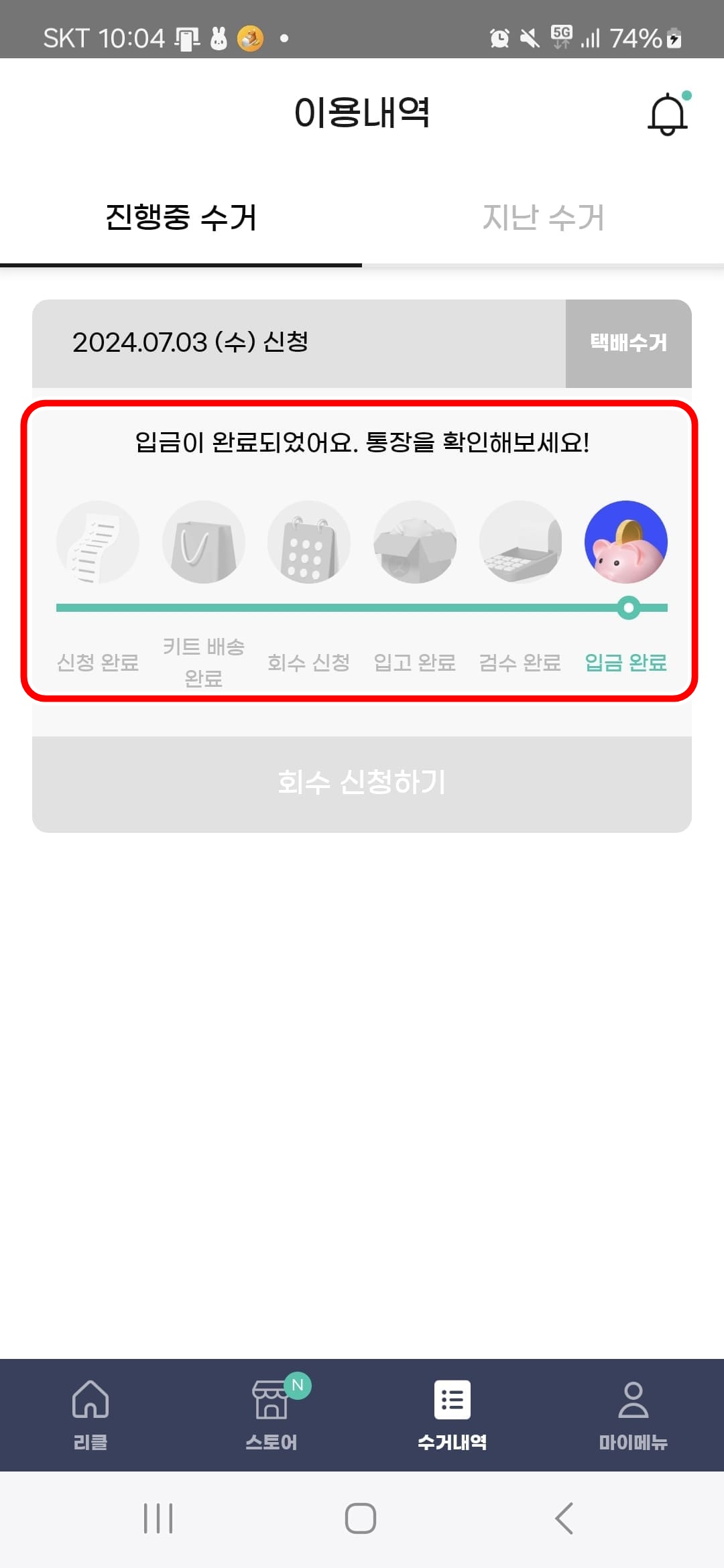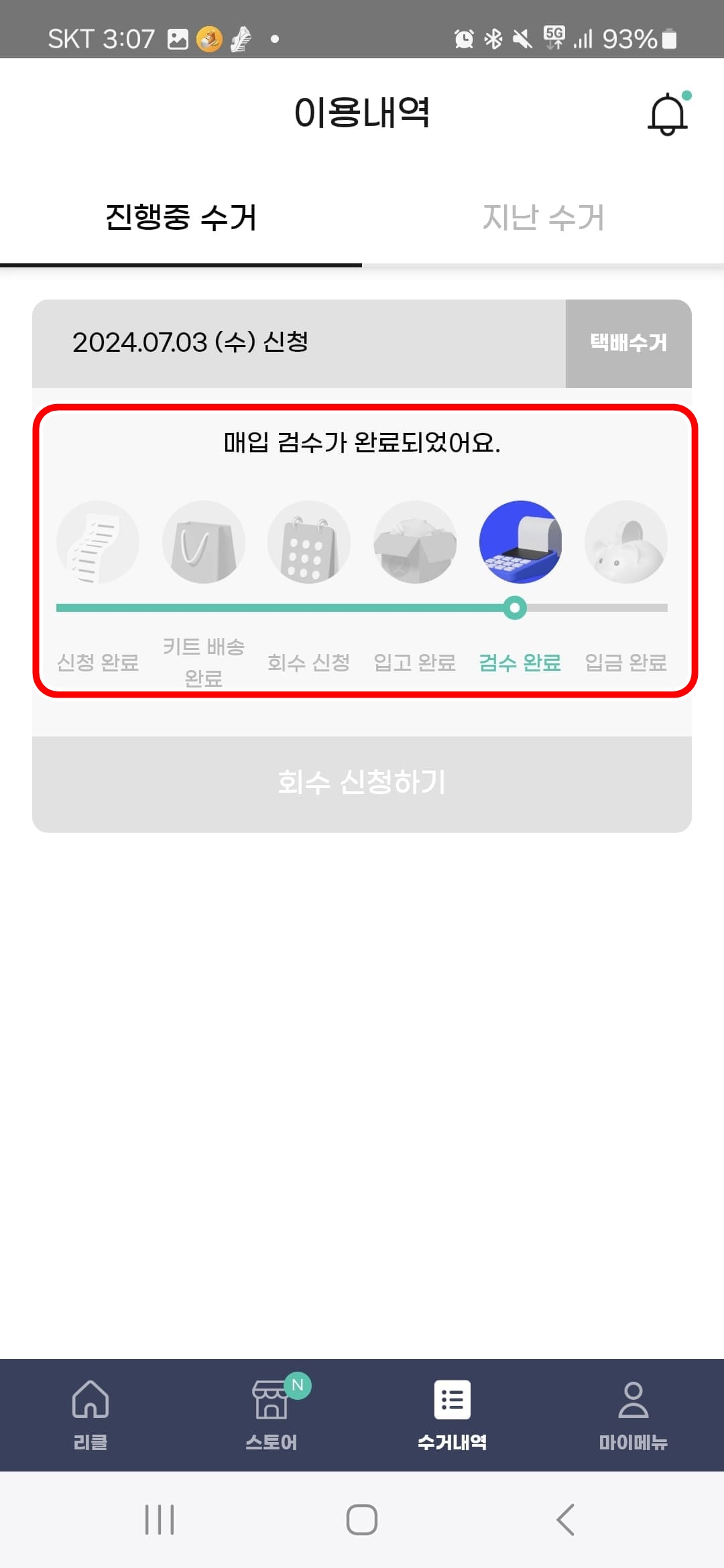 다시 수거내역으로 들어가서 보면 회수신청 단계로 넘어가있습니다.