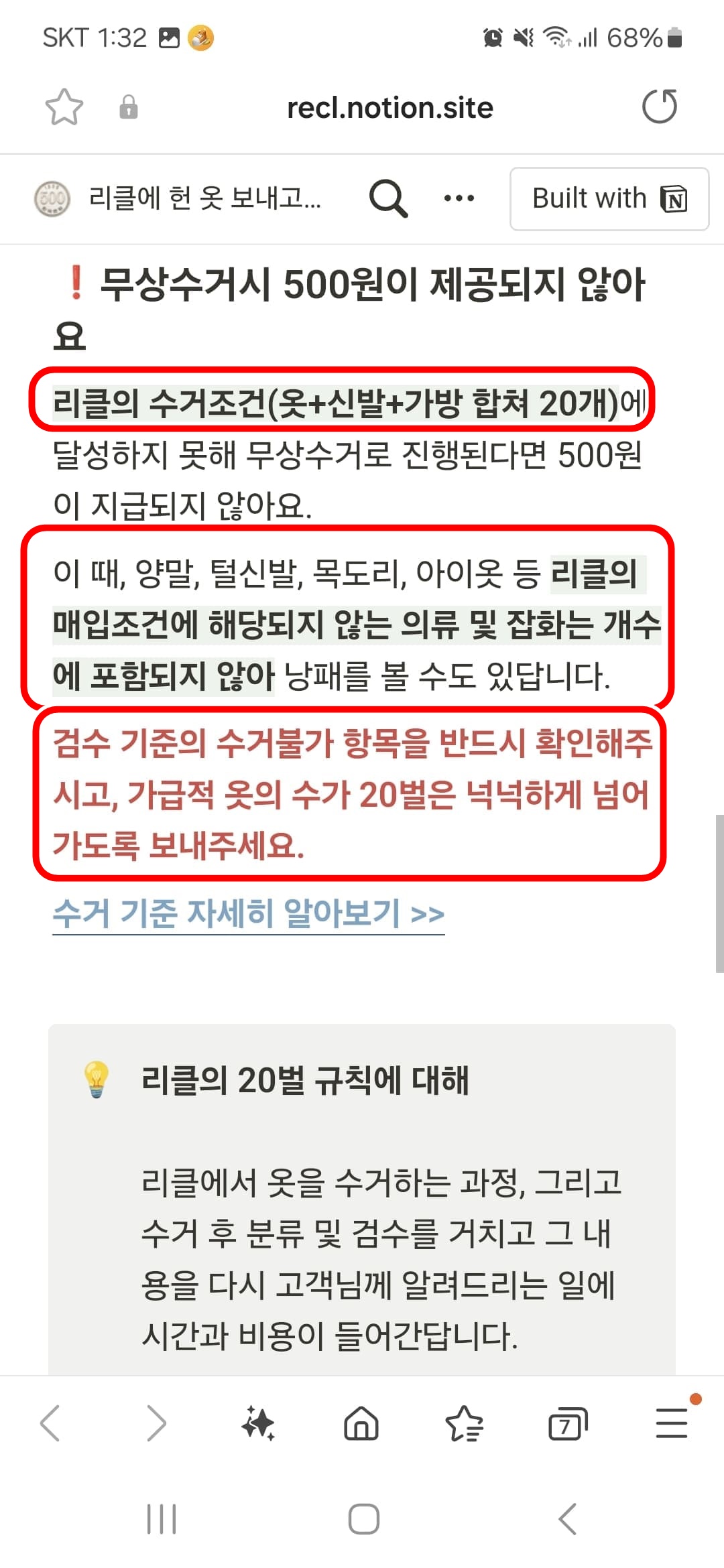 그리고 위의 캡쳐를 보시면 아시겠지만 20벌정도의 양이 있어야 수거가 되니 한번 읽어보시고 체크하시기바랍니다.