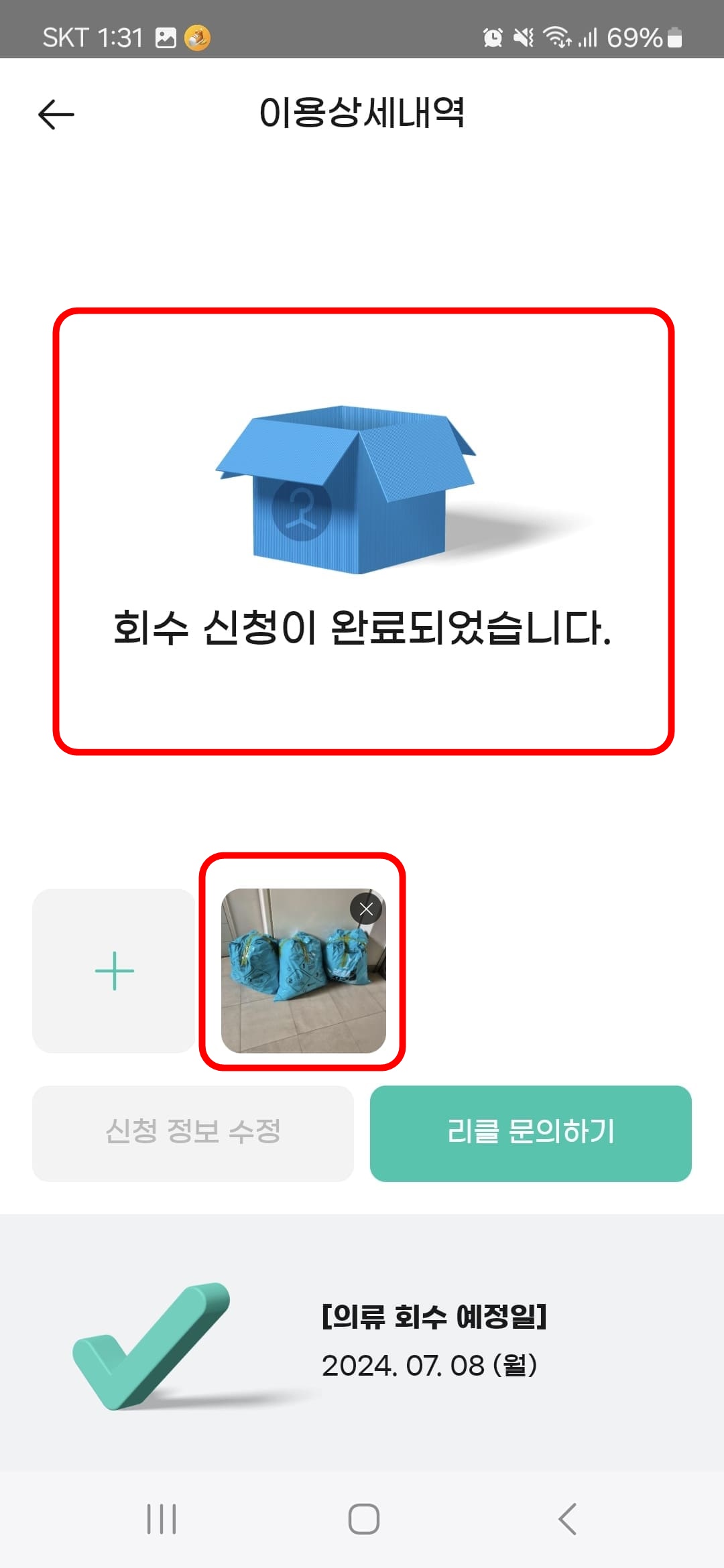 회수신청하기 눌러 현관에 내놓은 사진을 업로드 해줍니다.