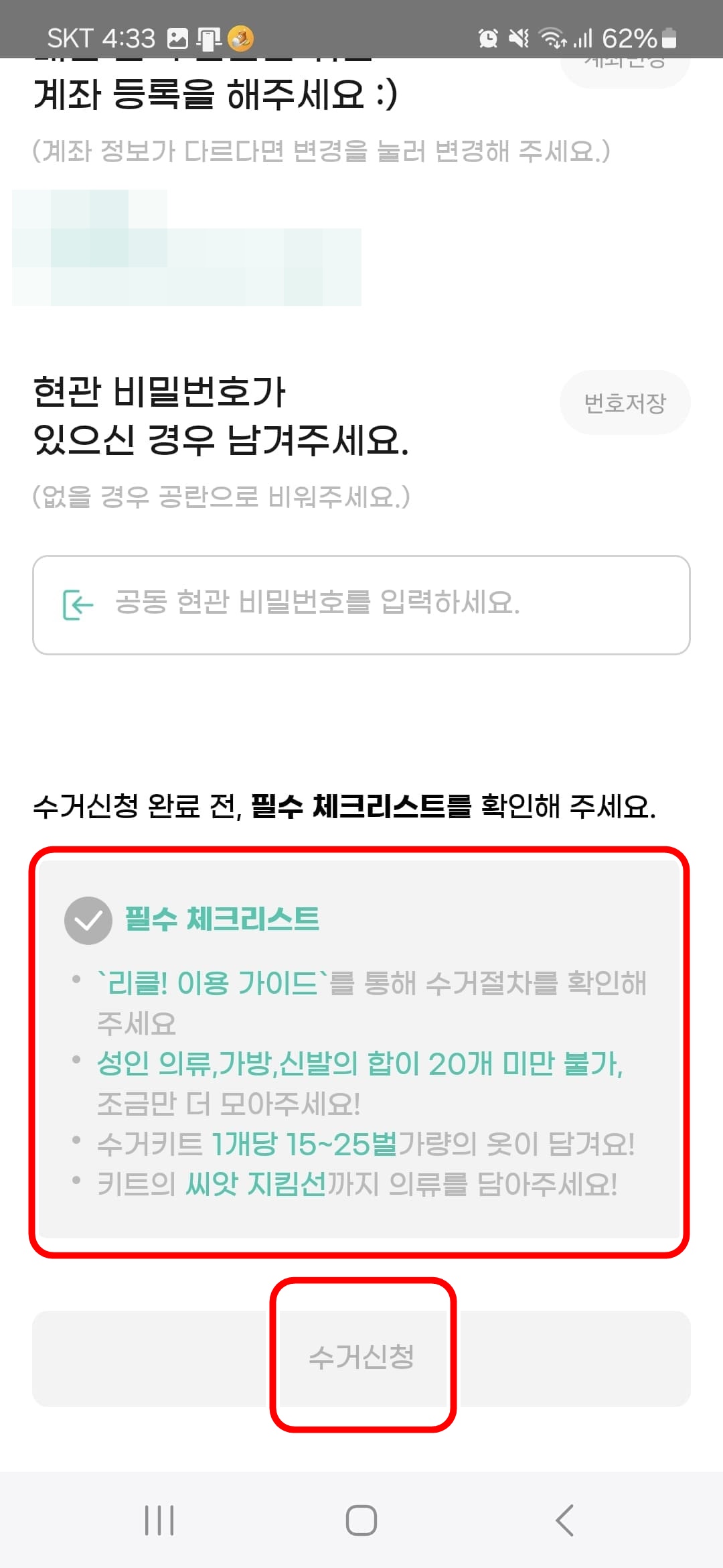 아래 파란색 동그라미 수거신청 버튼을 눌러서 진행합니다.