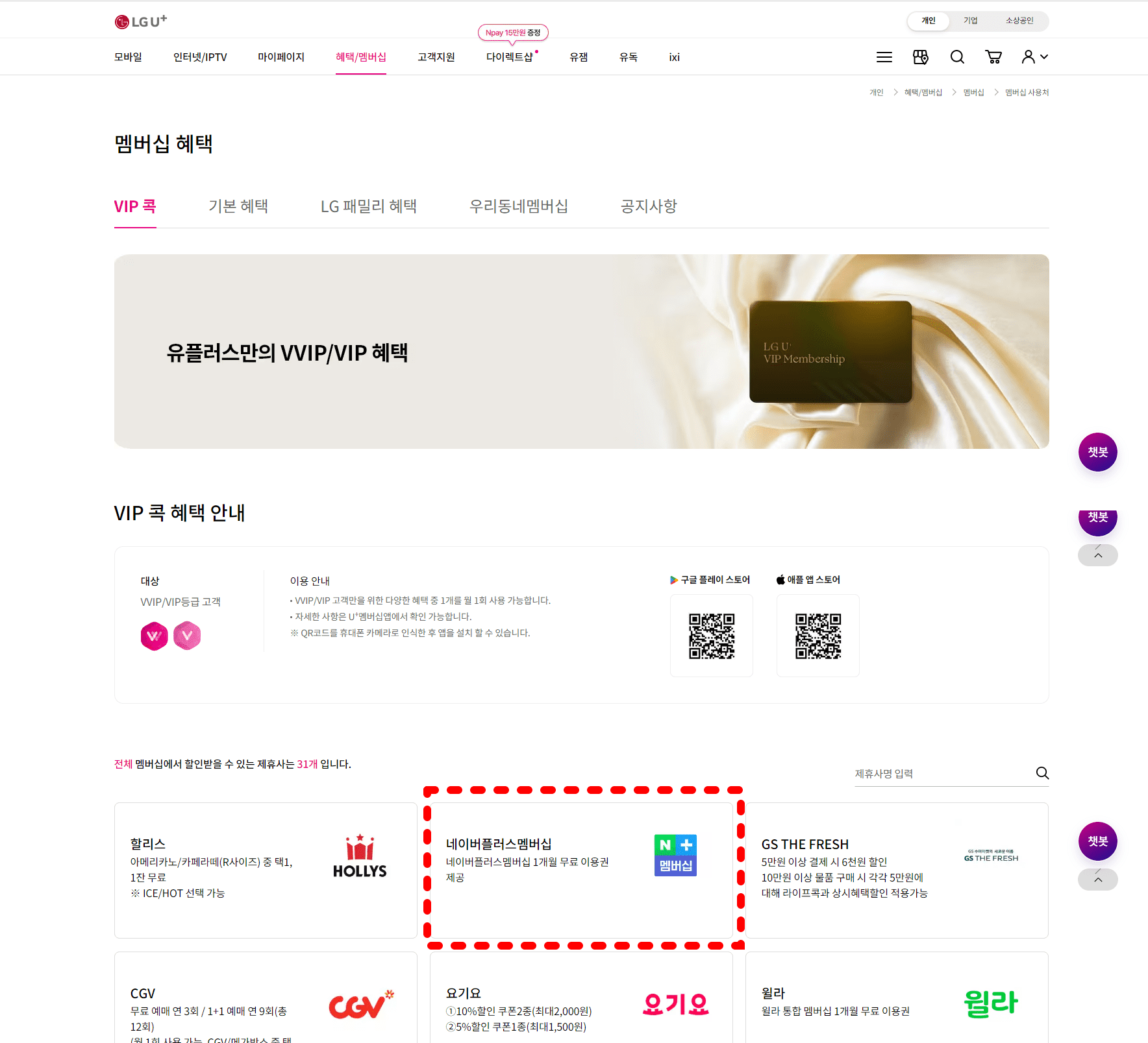 또, LG 유플러스 멤버쉽이 VIP이상이시라면 네이버플러스 멤버십 1개월 무료 이용권을 받으실 수 있습니다.