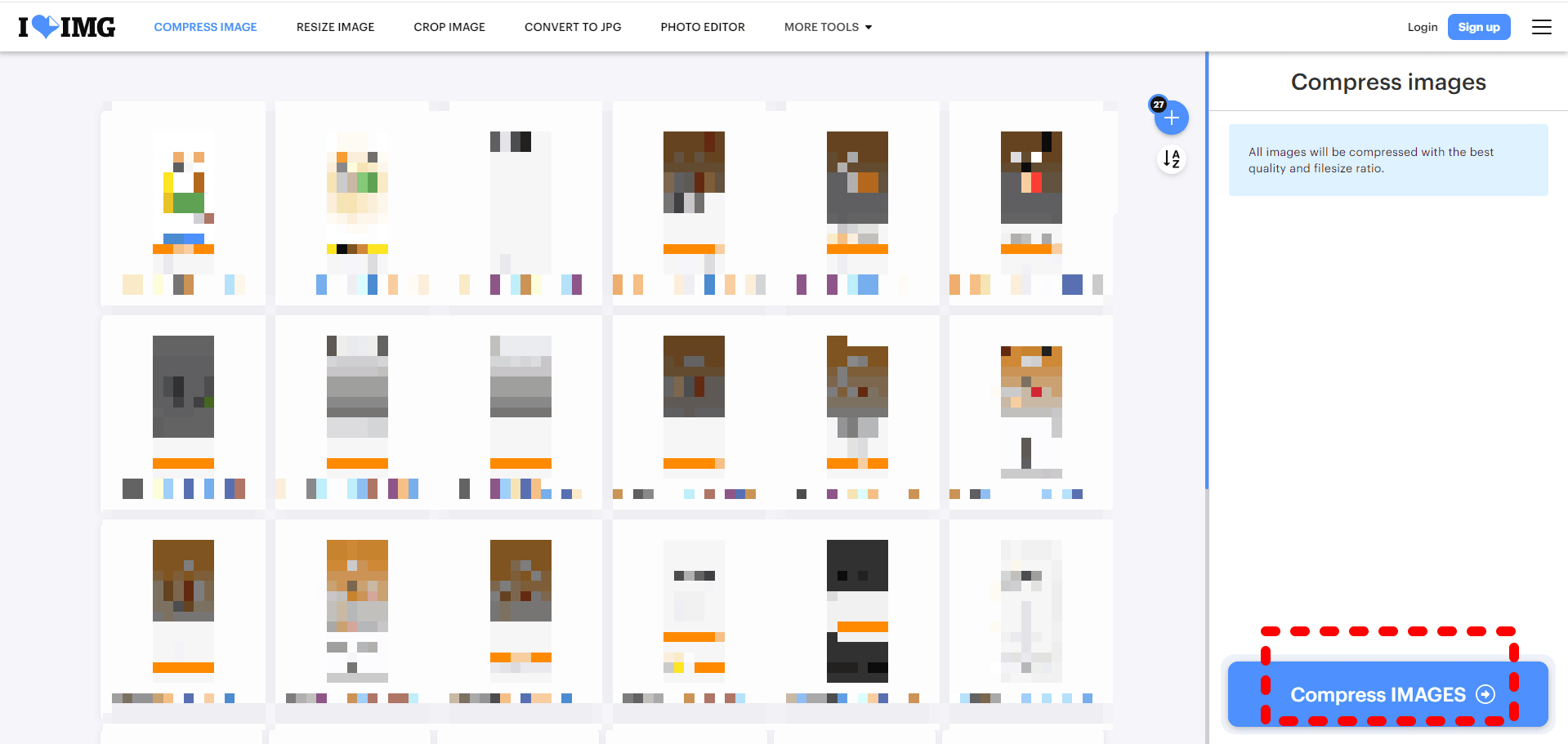 머리아파하지 마시고 맨 위쪽 왼쪽에 있는 컴프레스 이미지를 누르시면 됩니다.