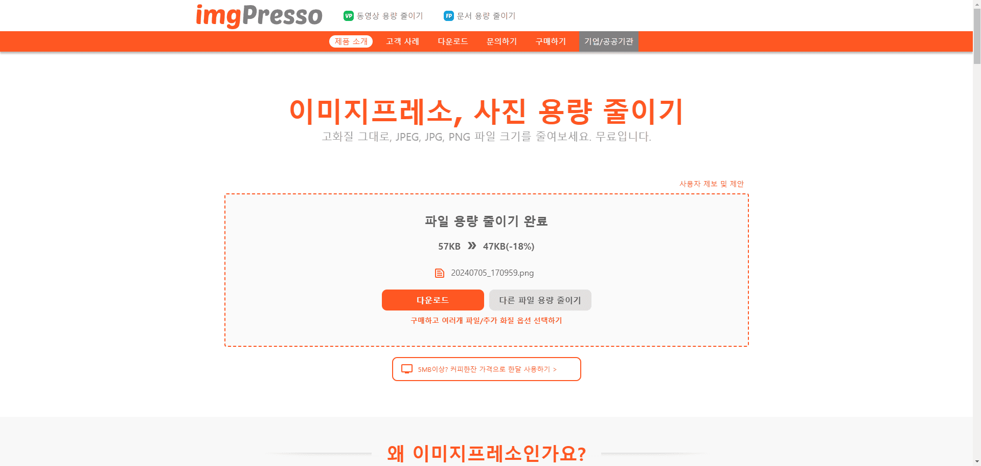 주황색의 다운로드 버튼을 누르시면 내 컴퓨터 다운로드 파일에 용량이 줄어든 사진파일이 받아집니다.