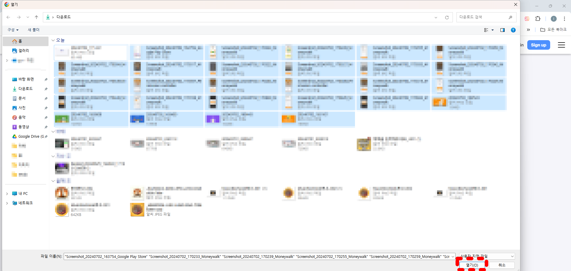 위의 화면에서 제가 빨간색 네모를 그려놓은 초록색 버튼을 누르면 사진파일들이 일괄적으로 다운로드 됩니다.