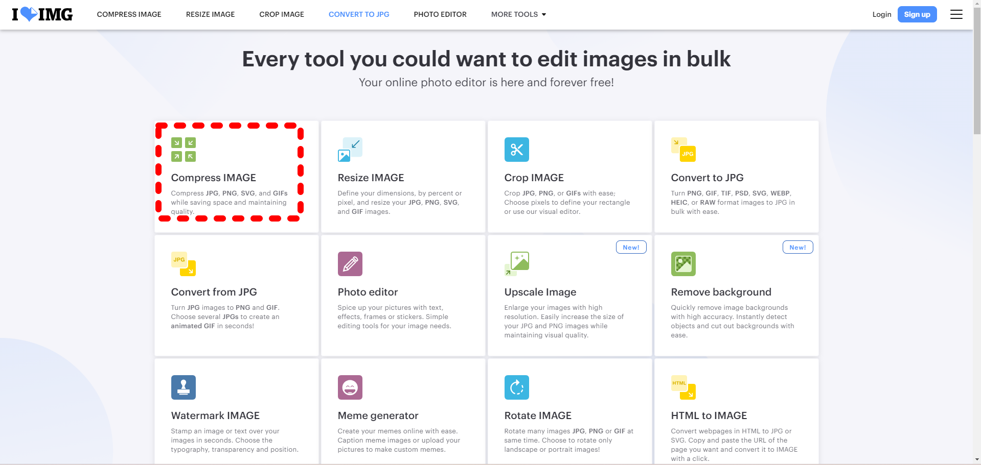 이 사이트에선 사진 파일 용량을 줄이는 것 뿐만 아니라 사진 사이즈를 재조절 한다든지 다른 파일로 변환한다든지 등 다양한 기능을 제공하기 때문에 위와 같이 메뉴가 많습니다.