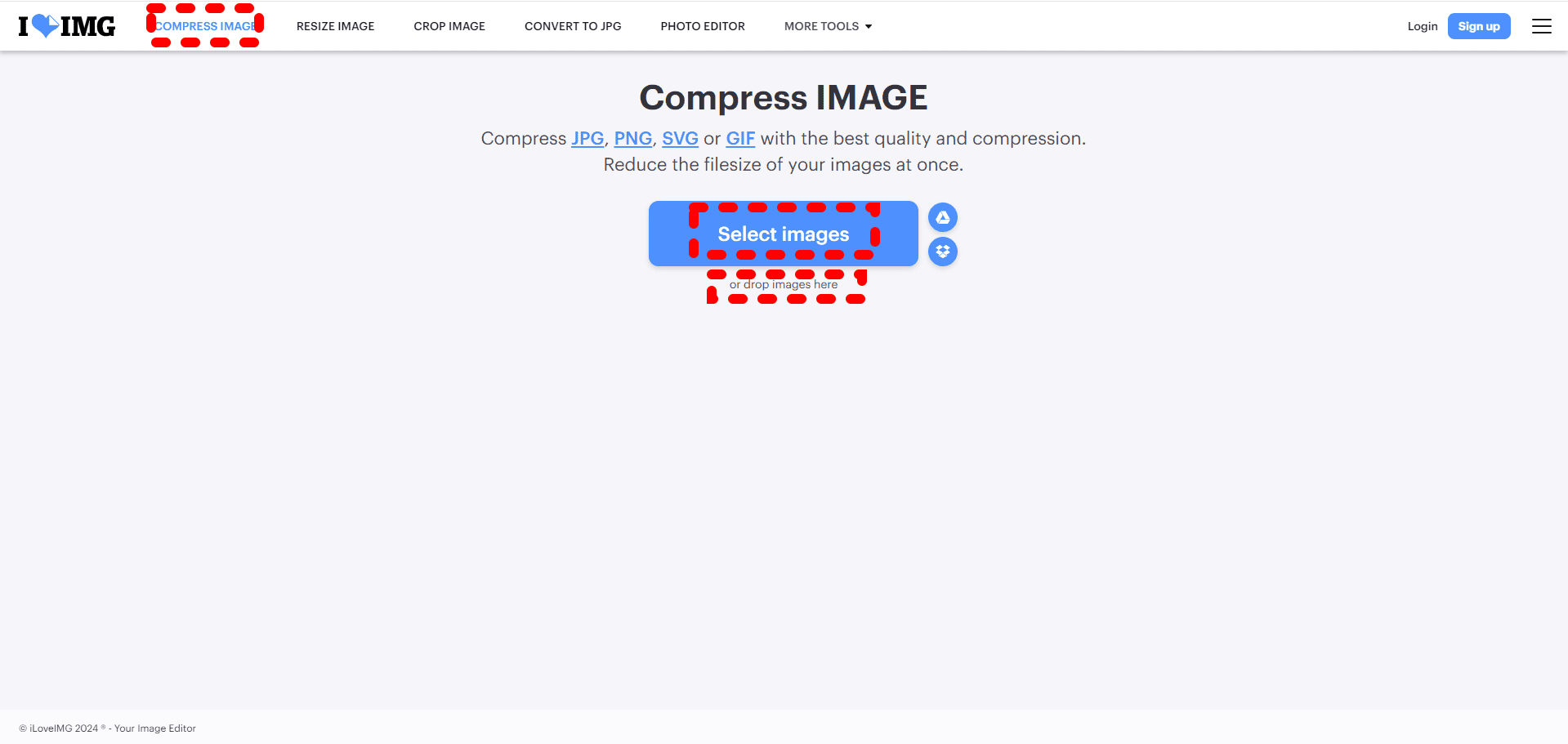 이미지 프레소를 들어가셔서 용량을 줄이고자 하는 사진 파일을 위의 사진의 빨간 네모 박스 그려놓은 곳에 옮겨 넣으시면 됩니다.