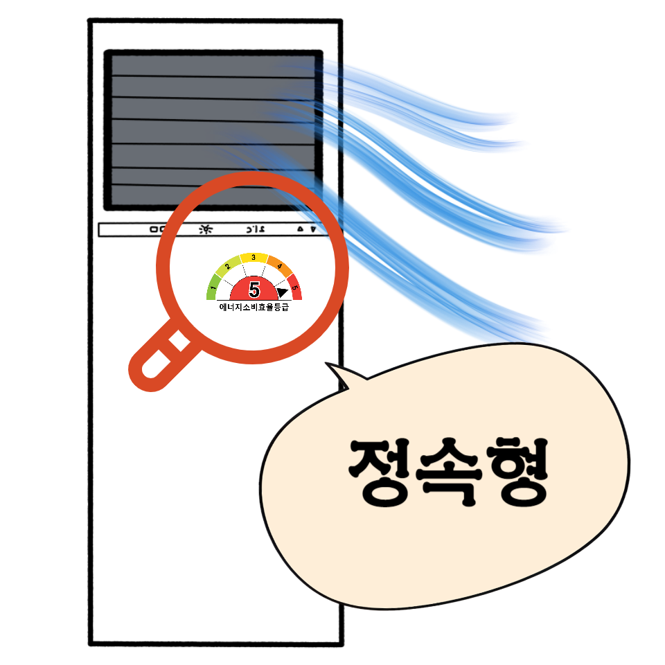 아래 그림과 같이에어컨 겉부분에 에너지소비효율5등급 딱지가 붙어 있습니다.