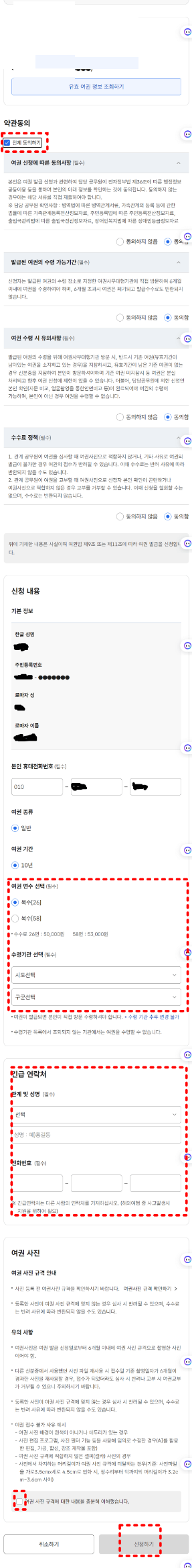 여권 계속 신청하기를 누르면 아래에 약관 동의하기가 있습니다.