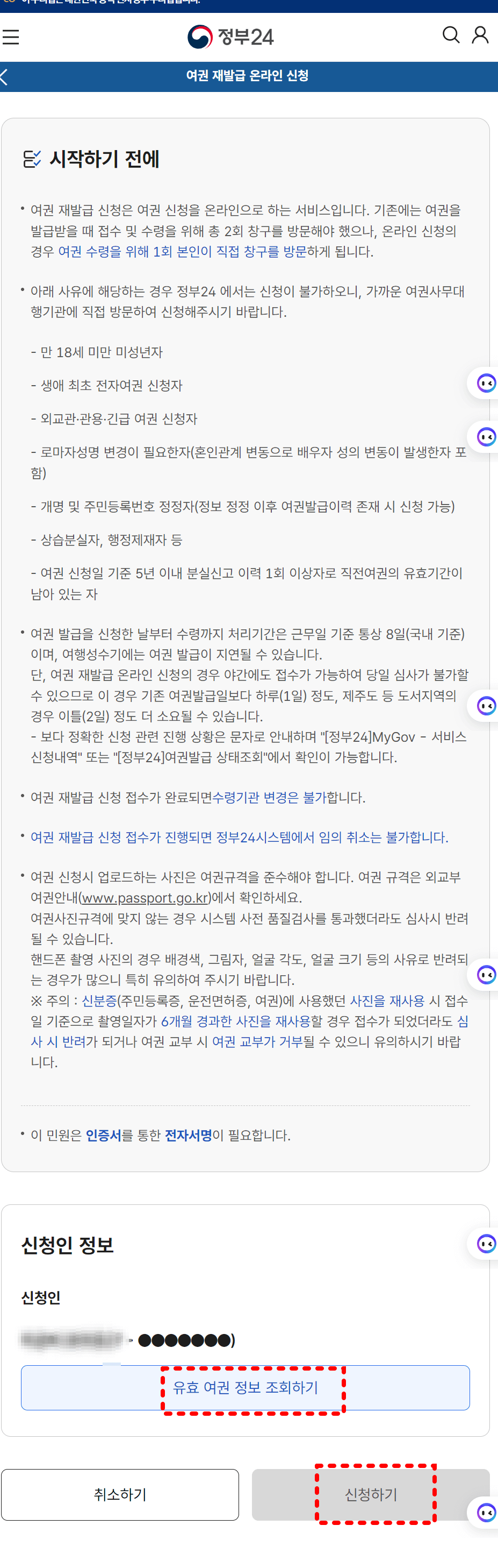 바로 아래에 유효 여권 정보 조회하기를 누릅니다.