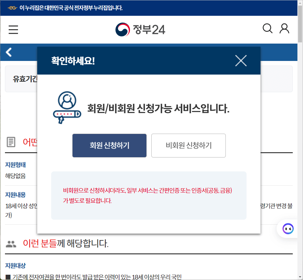 신청하기 누르시면 회원은 회원 신청하기, 비회원은 비회원 신청하기를 선택하십니다.