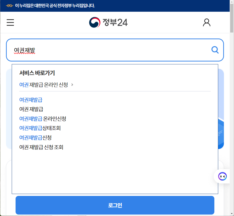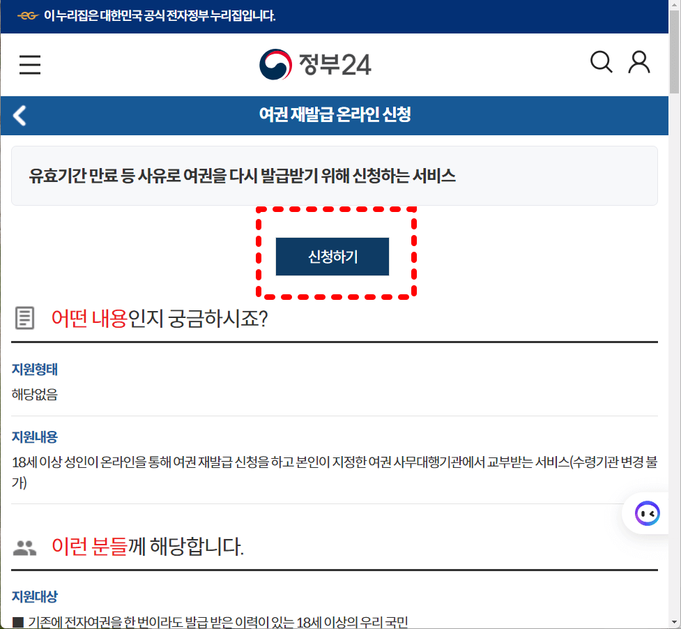 아래는 온라인으로 여권을 재발급 신청하실 수 있는 정부24 사이트 바로가기 버튼입니다.