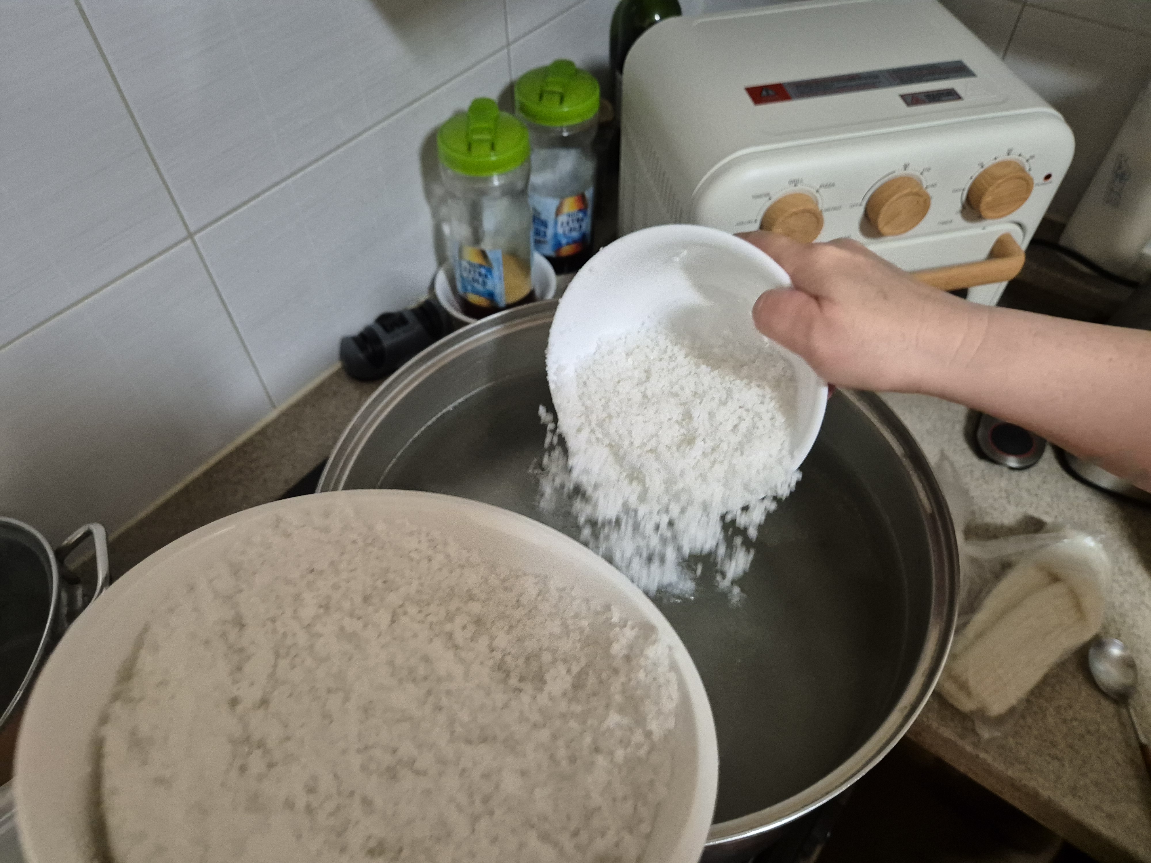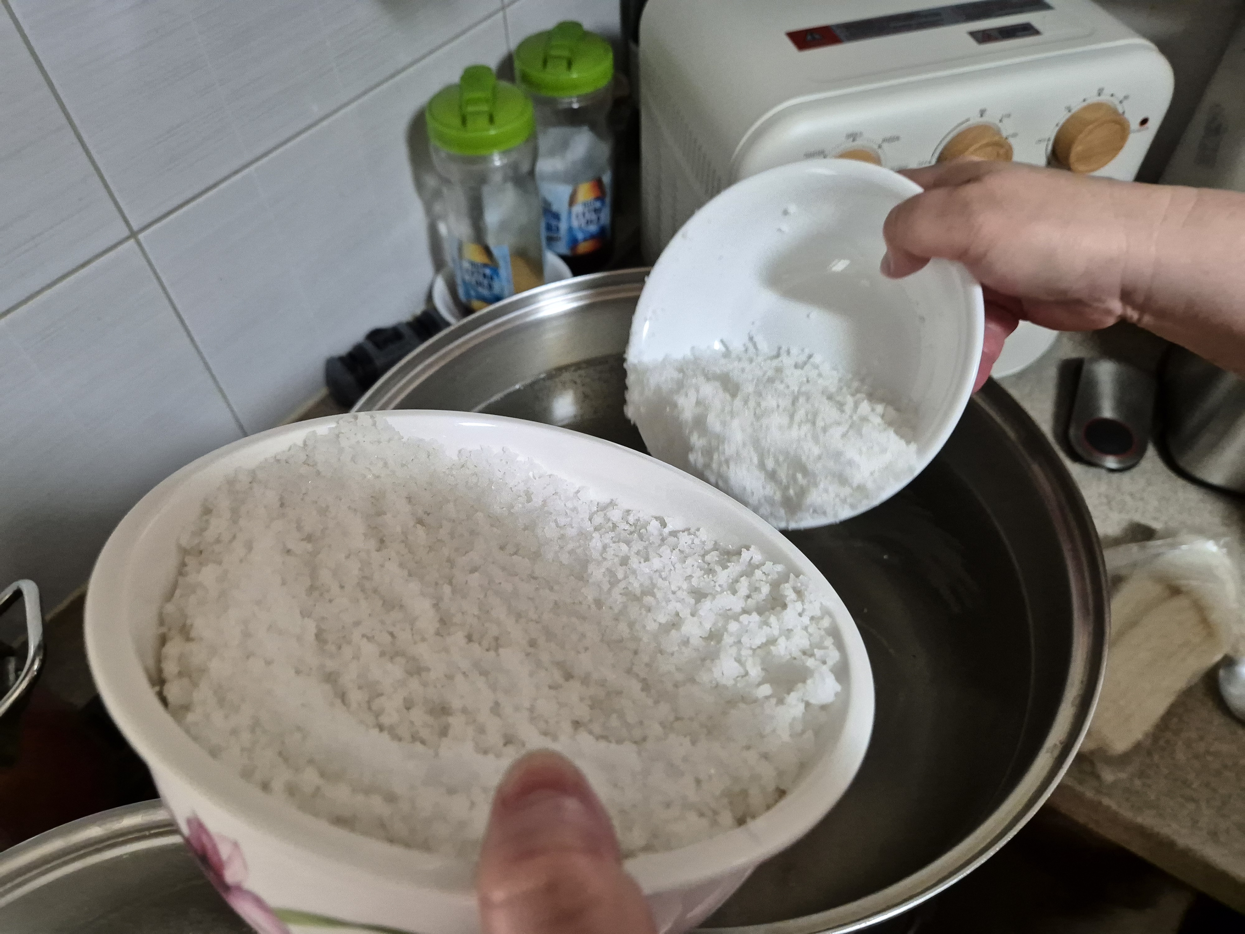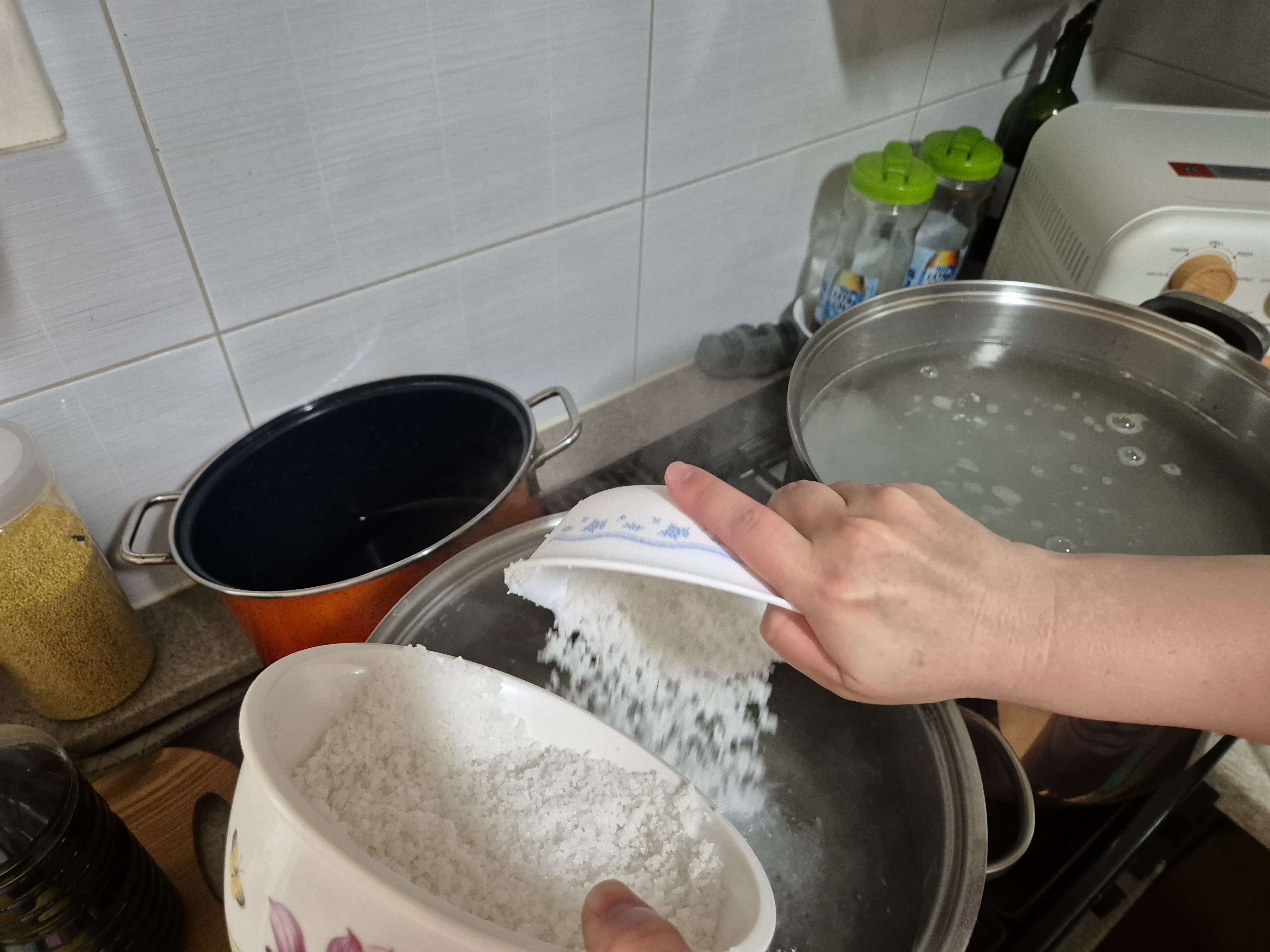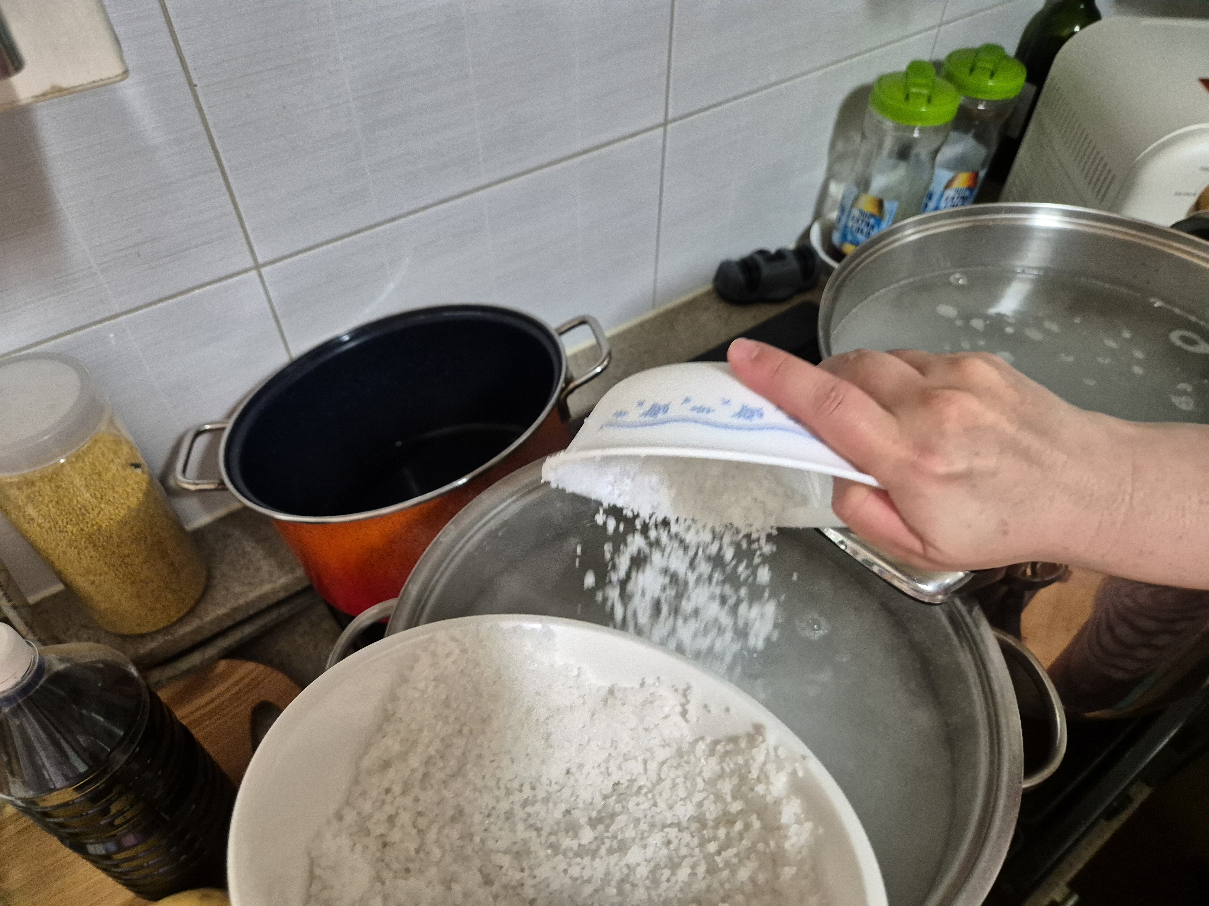 코렐 국그릇 기준으로 한 솥당 3~4 그릇의 소금이 들어갔습니다.