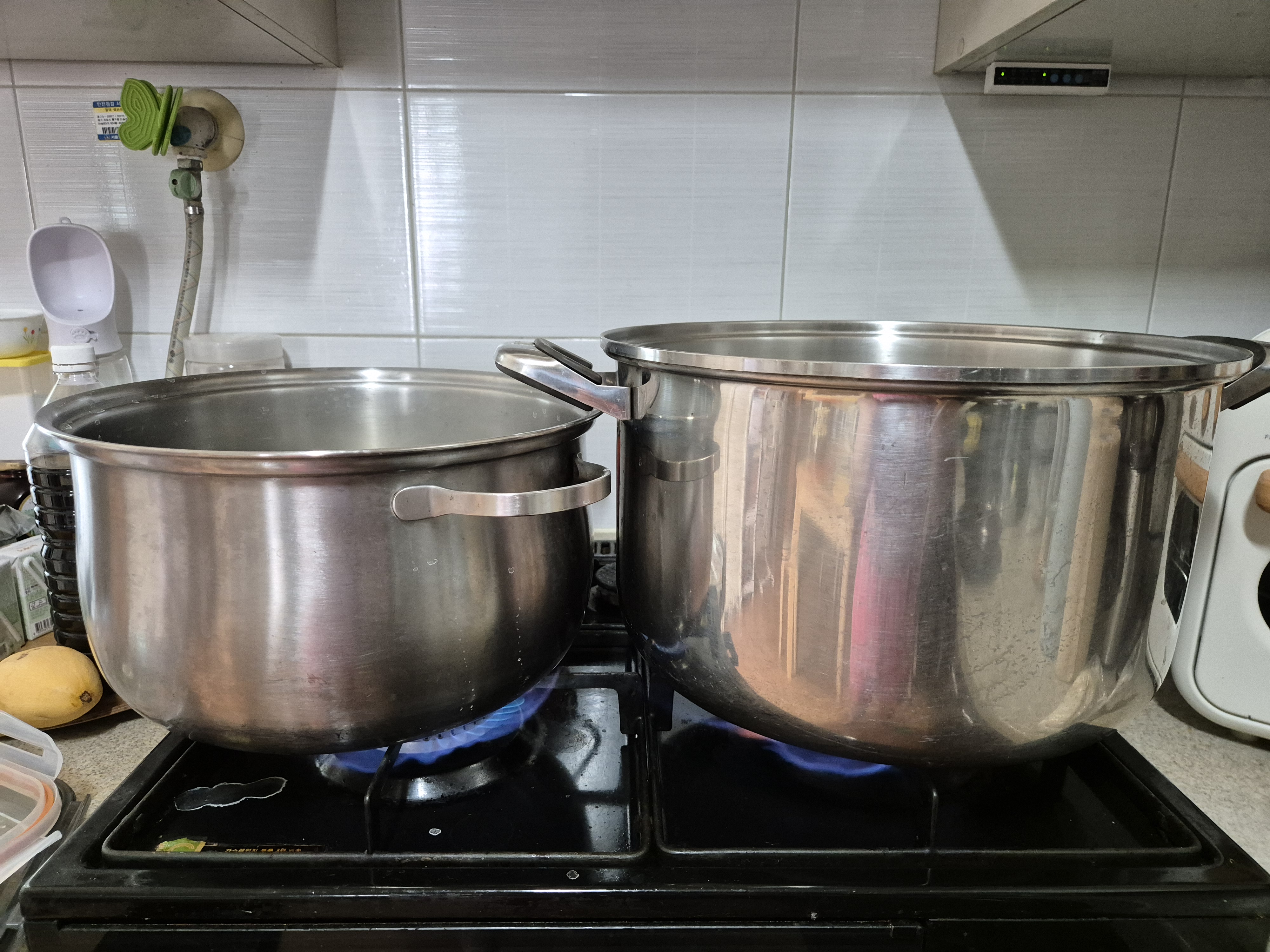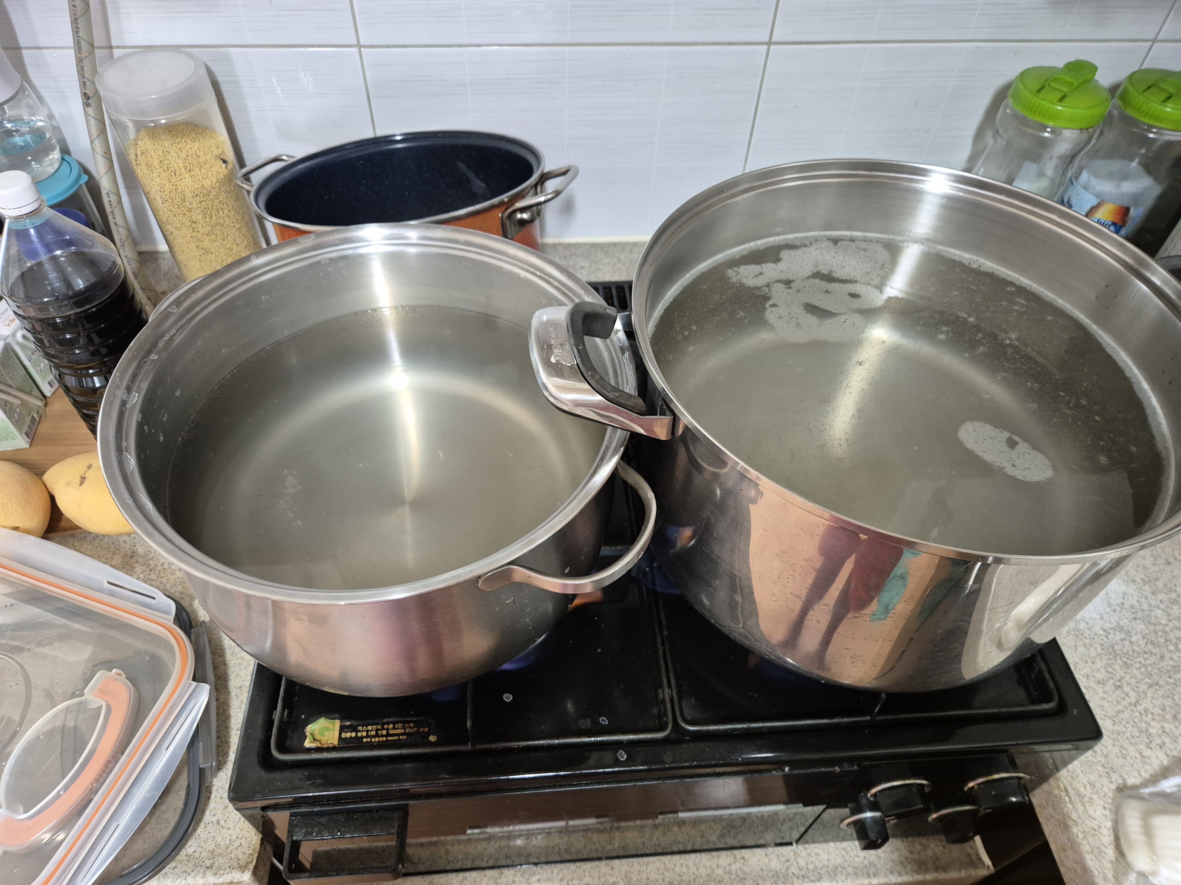커다란 곰솥 2개에 물을 담고 끓여줍니다.