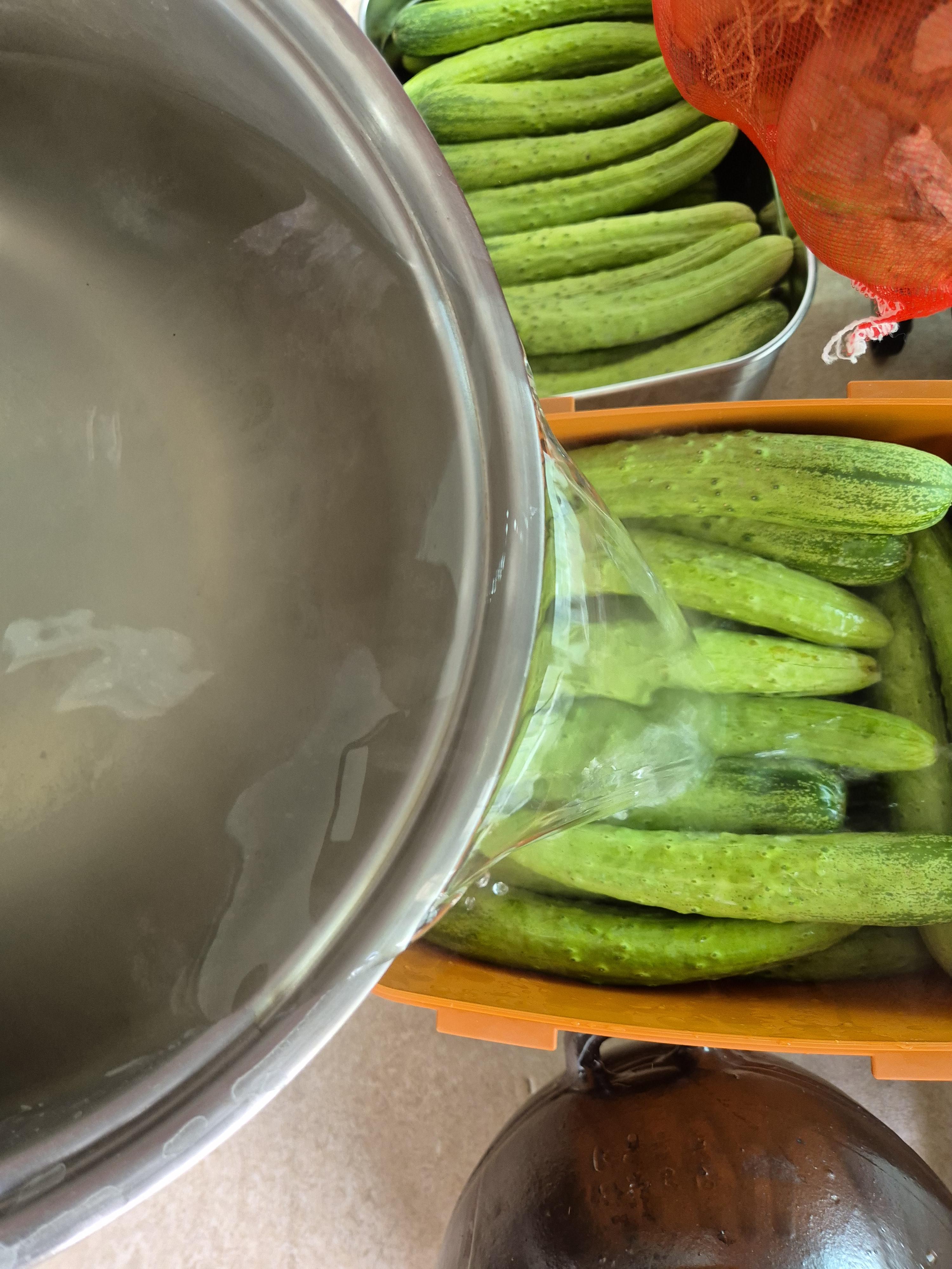 염도를 맞춘 물을 펄펄 끓인 후 바로 오이를 담았던 통에 오이가 잠길 정도로 물을 부어줍니다.