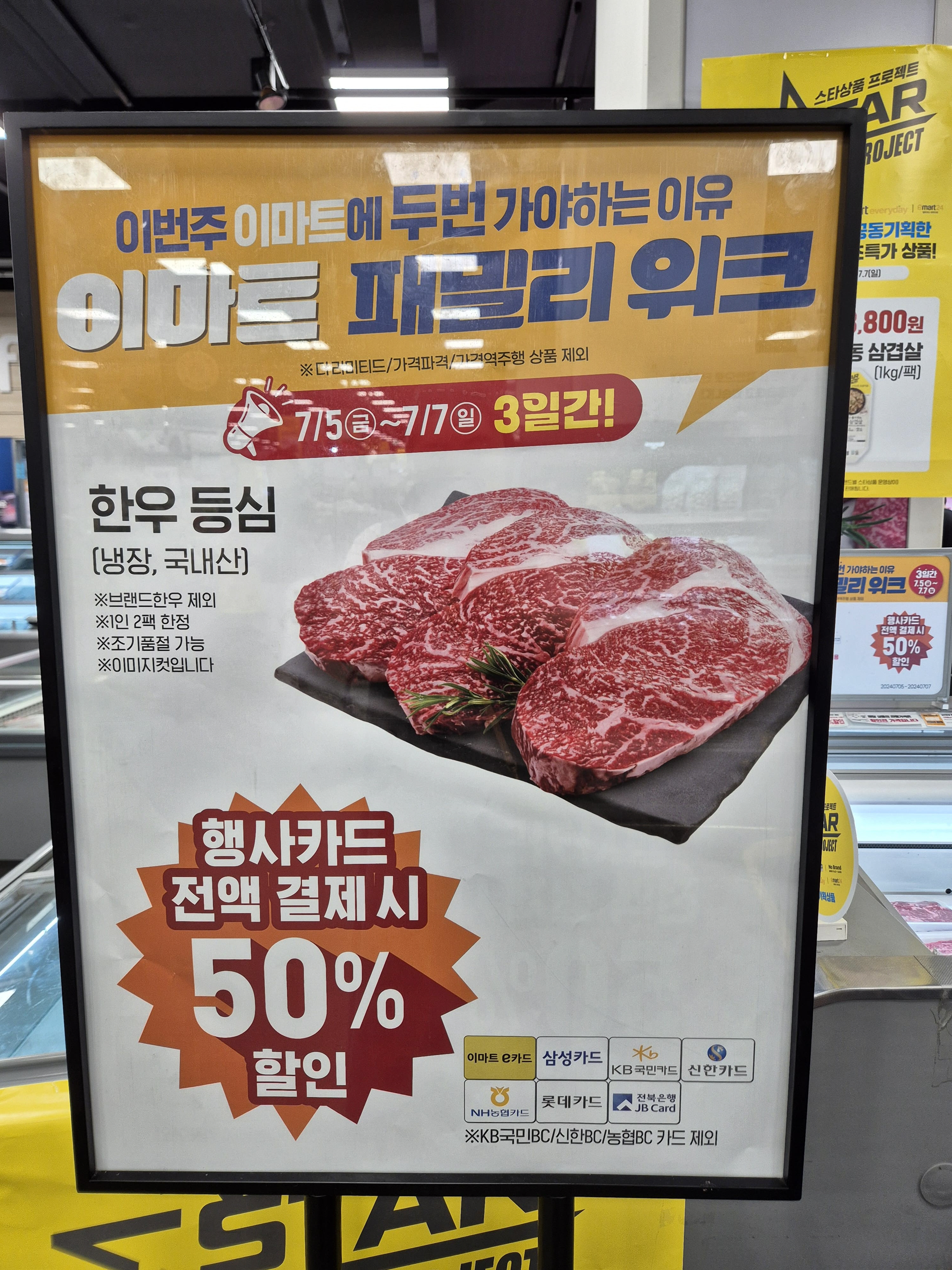이마트e카드, 삼성카드, 국민카드, 신한카드, 농협카드, 롯데카드, 전북은행카드 사용시 라벨에 붙은 가격에서 50%를 세일 해준다고 하네요!!!!!