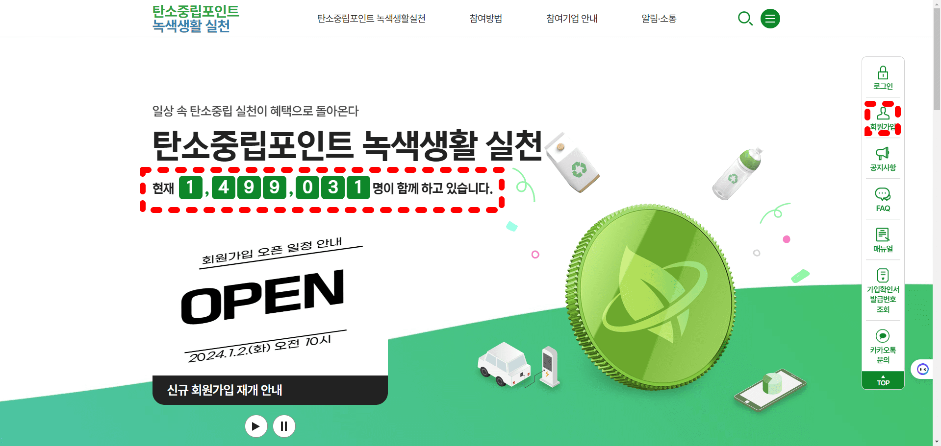제가 위에서 제공한 버튼이나 탄소중립 실천 포인트 누리집 사이트에 들어가셔서 오른쪽 회원가입을 클릭합니다.