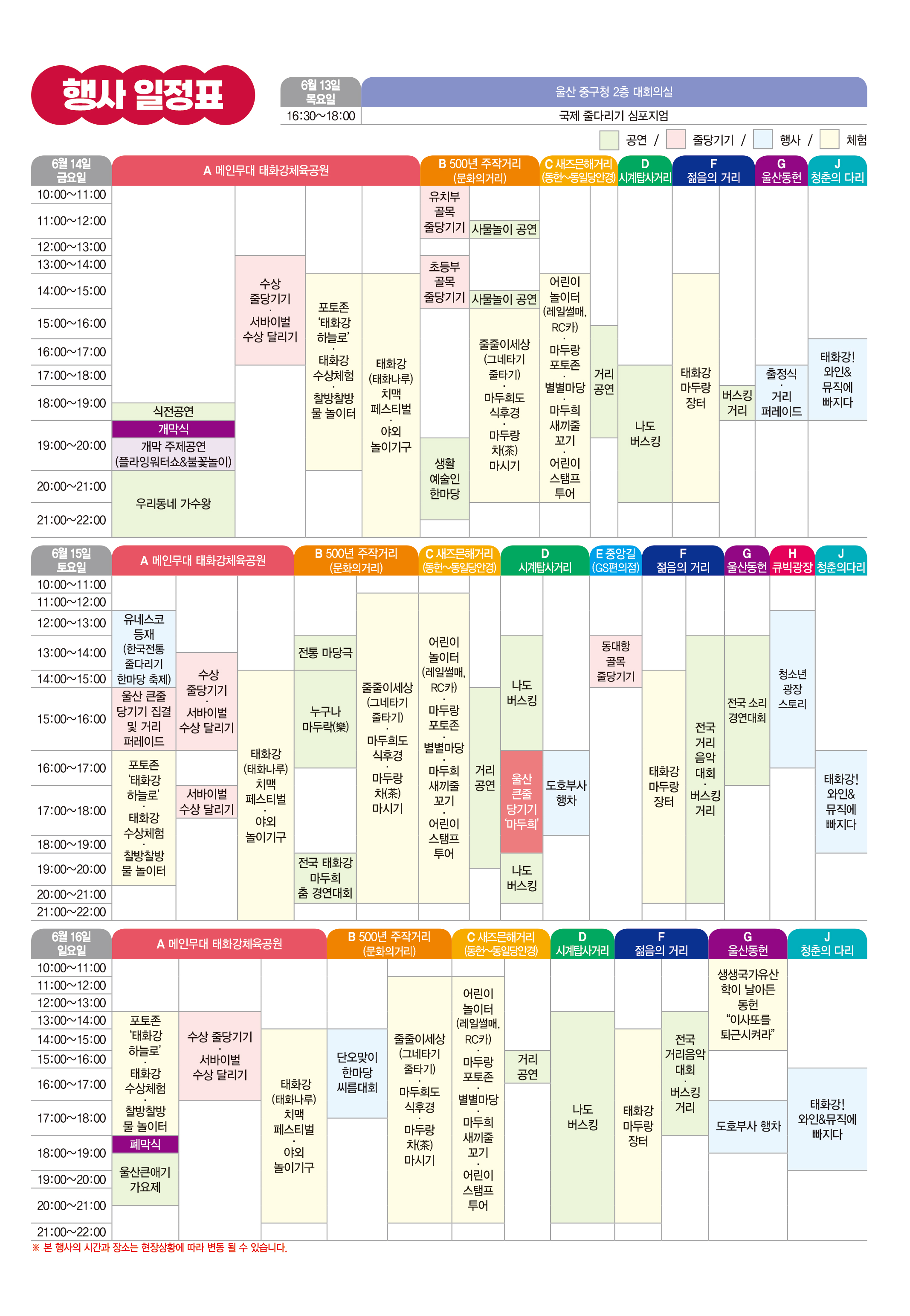 아래 전체 일정표를 잘 참고하시어 축제를 완전히 즐기시길 바라겠습니다.
