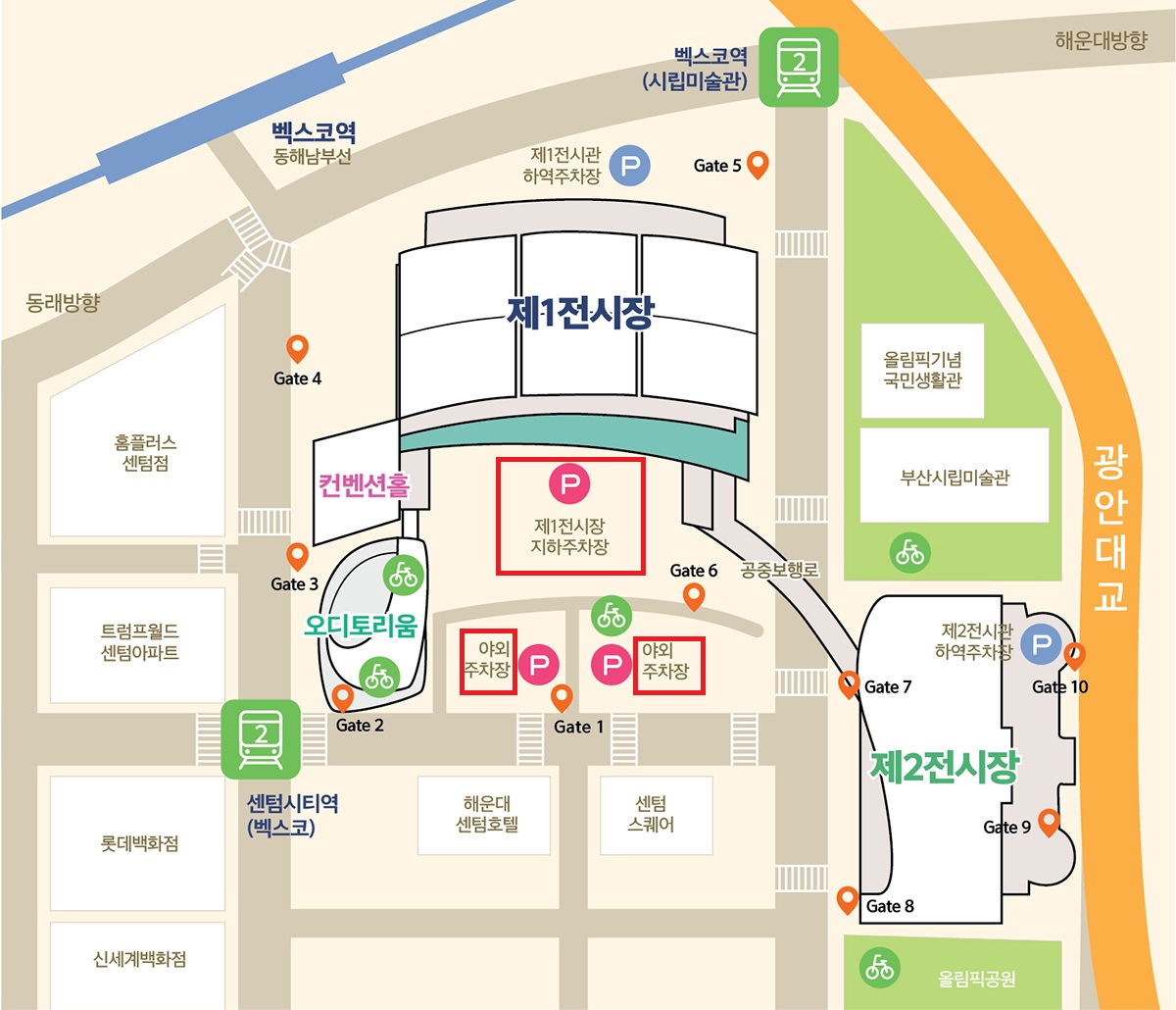 | KTX | 일반버스 : 40번 승차 후 벡스코 정류장 하차 급행버스 : 1001번 승차 후 벡스코 정류장 하차 지하철 : 부산역 1호선 > 서면역 2호선 > 센텀시티역 하차 > 1번 출구 |