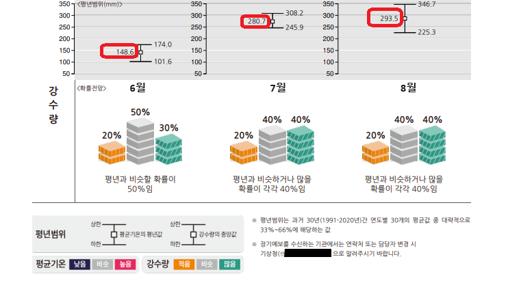 위의 그림과 같이 2024년 6월은 148mm, 7월은 280.7mm, 8월은 293.5mm 로 강수량이 예상됩니다.